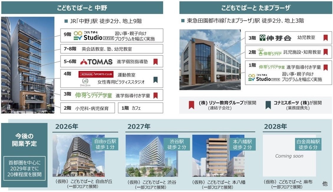 「こどもでぱーと」は、子育てや教育機能を集約し、子ども一人ひとりに合った最適なサービスを提供する施設 です。また、コンシェルジュや送迎機能を設け、教育における保護者の不便や不安を解消するサービスも提供します。本施設での学びや体験を通し、子どもたちの好奇心を育み、一人ひとりの未来を創造することを目指し ます。現在、2025年4月に開業した「中野」・「たまプラーザ」に「自由が丘」「渋谷」「本八幡」「麻布」を加えた6件が既に事業化済、2029年を目途に、首都圏を中心に20棟程度の事業化を目標に推進してまいります。(公式HP: https://kodomo-depart.jp/)