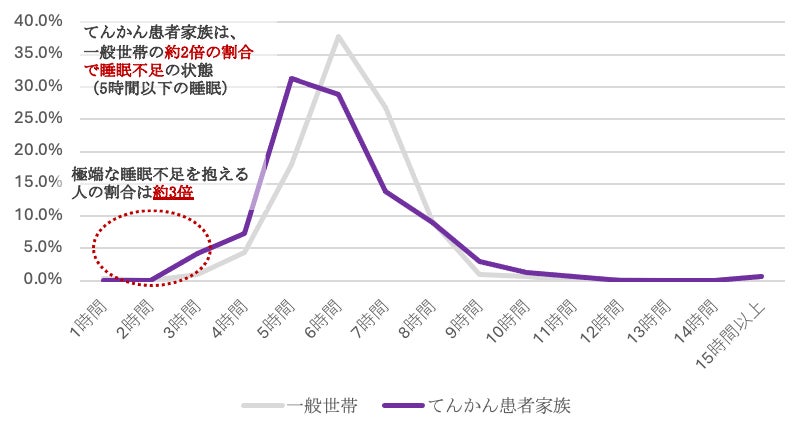 ・1日3時間以下の睡眠時間4.2%:極端な睡眠不足にあたる3時間以下の睡眠時間の割合は、てんかん患者ご家族 4.2%。一般世帯1.4%に比べ約3倍。