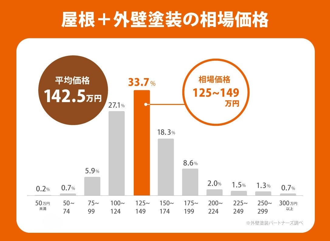 こちらの価格帯の分布では「125〜149万円」が33.7%で最多となっており、外壁のみの塗装と比べて、相場全体が1ランク上にシフトしていることが分かります。