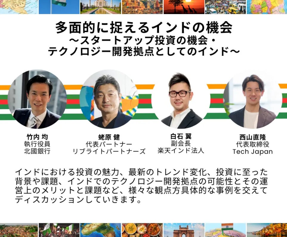 内容:インドにおける投資の魅力、最新のトレンド変化、投資に至った背景や課題、インドでのテクノロジー開発拠点の可能性とその運営上のメリットと課題など、様々な観点方具体的な事例を交えて