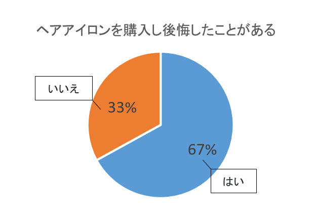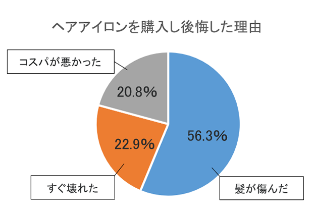 ヘアケアに興味のある男女約100名に「ヘアアイロンを購入し後悔した経験」についてをリサーチ。後悔したと答えた人の理由として、上位にランクインしたのは「髪が傷んだ」が56.3%でした。安価だからと購入したアイロンを使用し、切れ毛や縮れ毛になったという意見や、高級なアイロンを購入したが、上手く使いこなせなかったという意見も目立ちました。