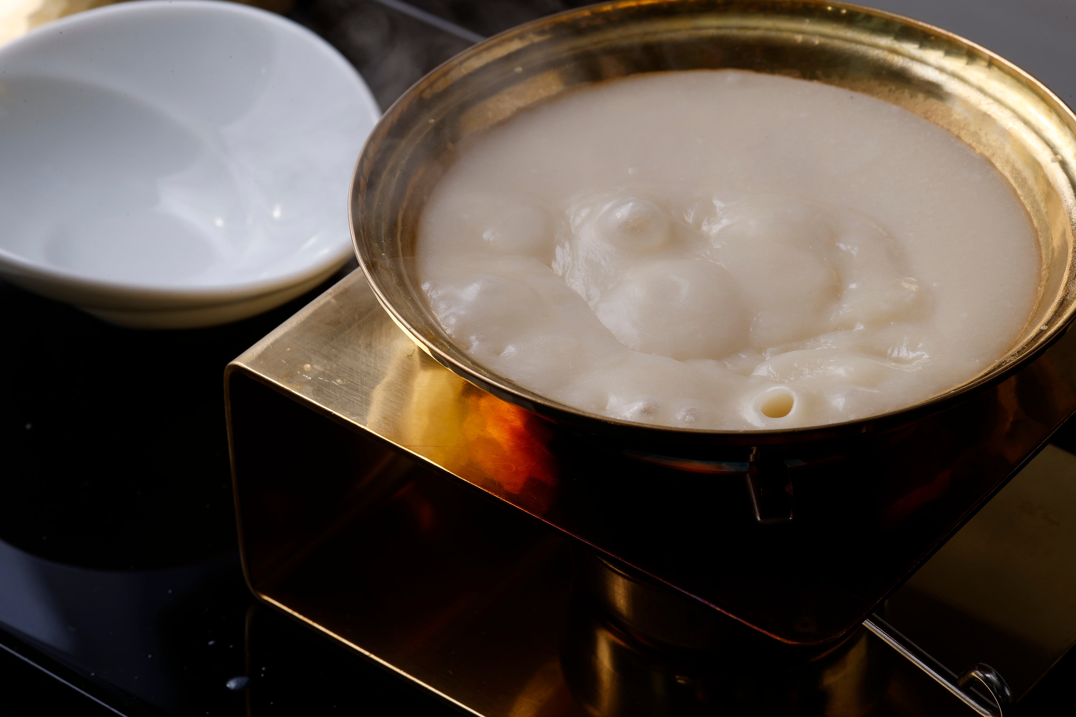 ウェルカムドリンクは現在ご好評の「引き立て一番出汁」です。寝かしてうま味を増した「蔵囲い昆布」と「枯節」をたっぷりと使用し、凝縮したうま味と塩気で、甘みへと誘います。時間と共に変化する昆布と鰹節の風味を、スイーツの合間にお楽しみください。