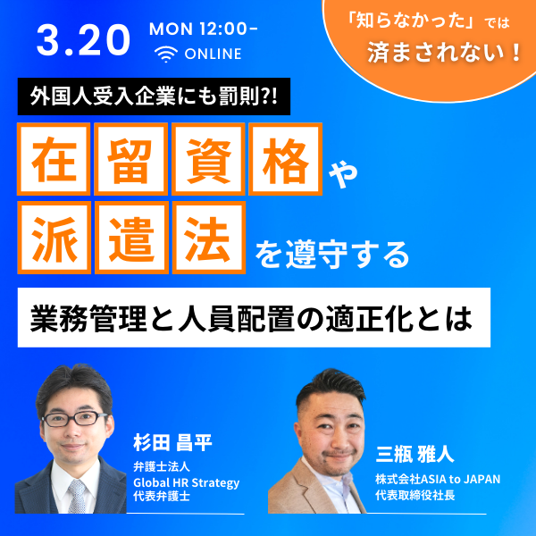 【3月20日(月)ウェビナー実施!】~「在留資格」「派遣法」を遵守する業務管理~外国人雇用で生じる人員配置は果たして適正か?外国人雇用や移民問題の第一人者が徹底解説!