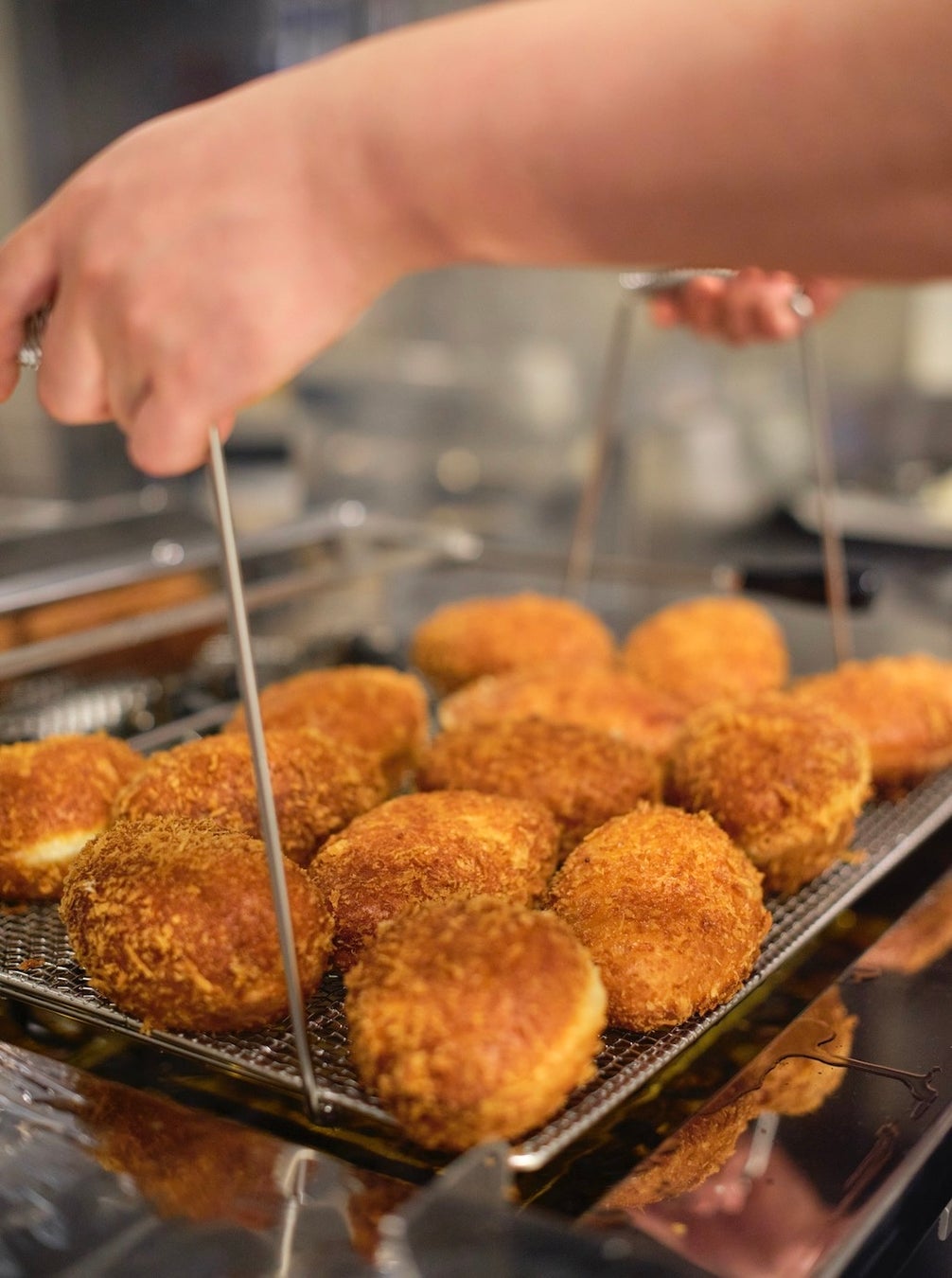 工場直送の生パン粉を使用しており、粗さなどはmm単位の調整をし、更にはテイクアウト=時間が経ってもサクサク感を残す為にパン粉に独自の粉をブレンドする事により、家に帰って食べてもサクサクした食感になるように仕上げております。