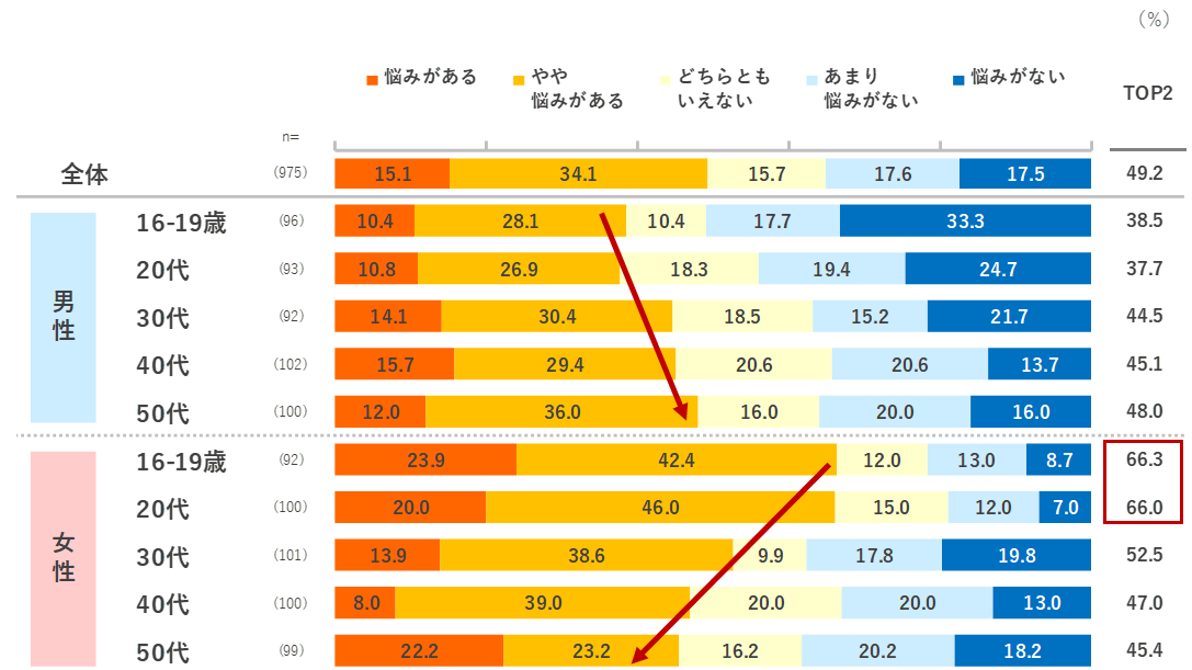 - 約半数が悩みあり(TOP2:49.2%)と回答。女性はZ世代中心の20代以下若年層で7割弱と悩む人が非常に多いのが特徴。また、女性では年代が上がるほど減少するが、男性は年代が上がるほど悩む人は増える傾向。