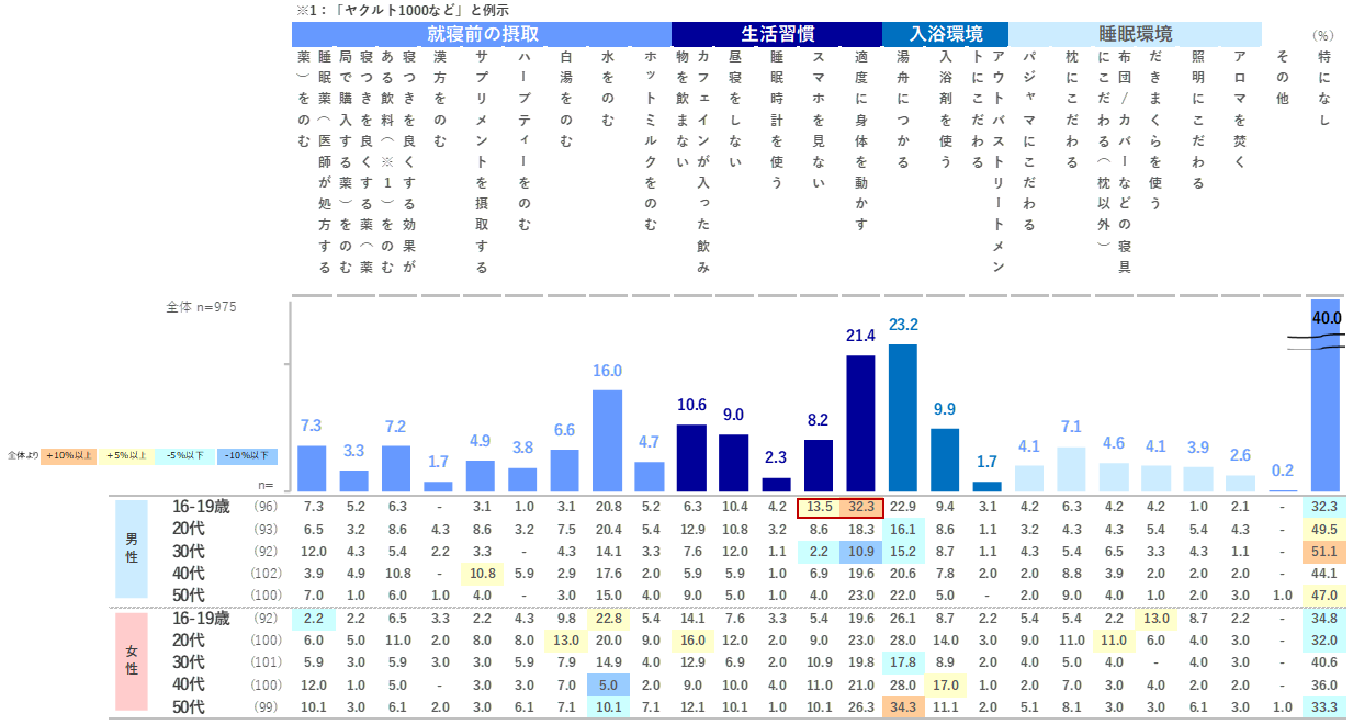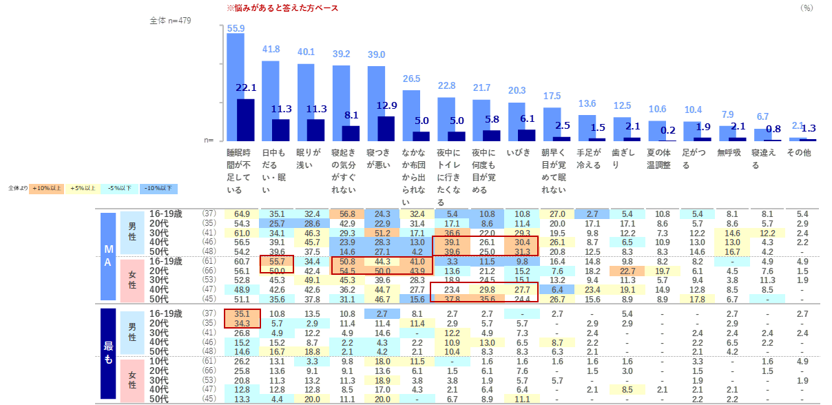 - 「悩みがある」では「睡眠時間が不足している」が55.9%、「最も解決したい悩み」でも22.1%と共に最も多い。女性20代以下では日中のだるさなど寝起き・寝つきの悩みが多い一方、男女とも40・50代は夜中のトイレ・いびきなど睡眠中の悩みが多い傾向。