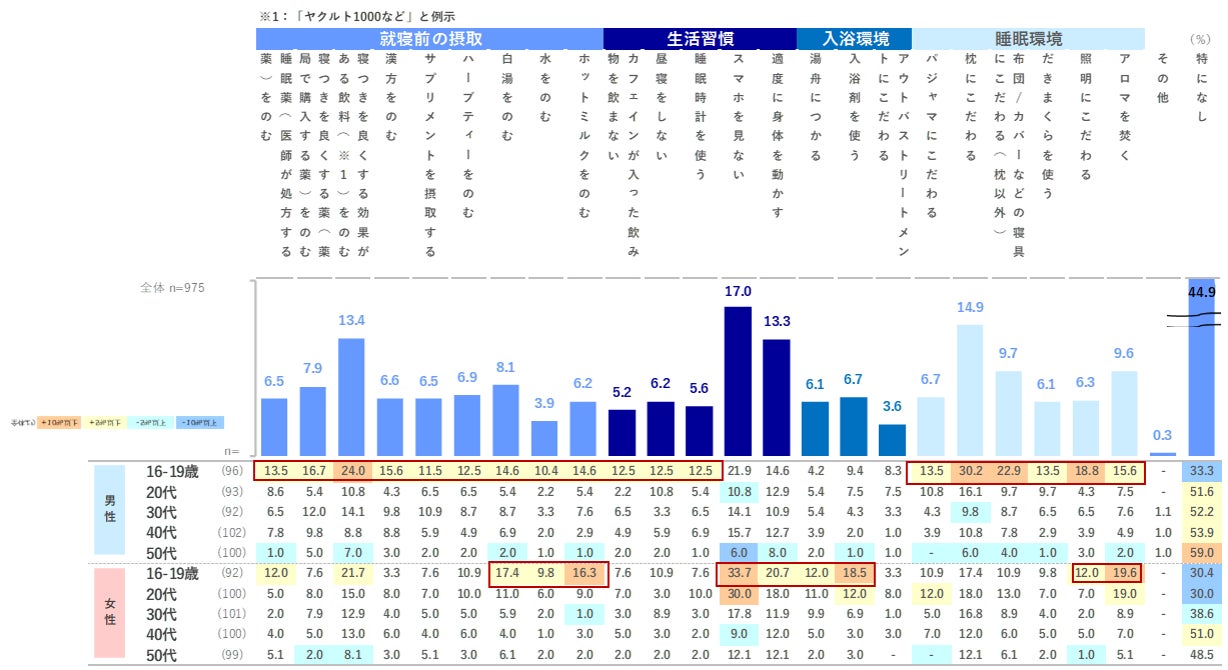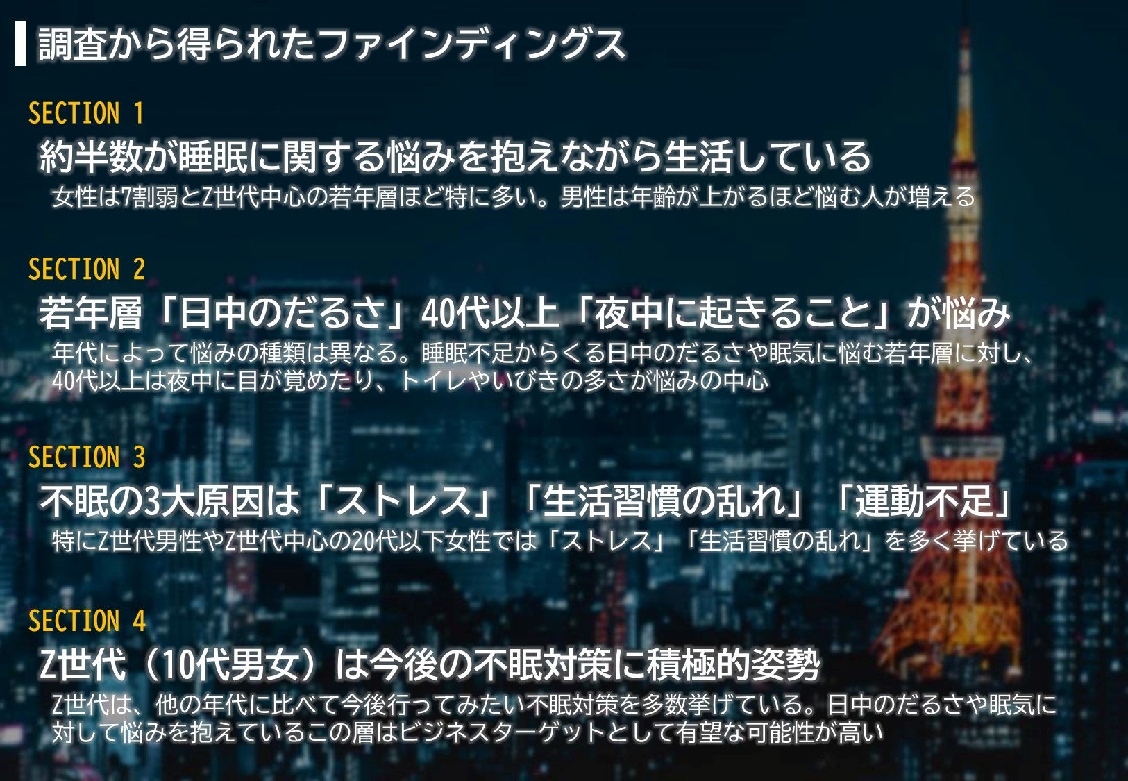 今回の調査では、約半数の方が 睡眠に対する悩みを抱えている、不眠大国日本の姿が浮き彫りになりました。若年層では睡眠不足からくる日中の眠気や寝つきや寝起きに悩んでいる一方、中高年は睡眠中親世代は、夜中に何度も起きてしまうといった睡眠の中断関連を多く挙げていることが特徴です。「睡眠の質を高める効果」を謳う製品が数多く発売されている昨今。悩みの種類をひとくくりにせず、今後は睡眠の悩みを細分化し、各々のニーズに合わせた製品開発が必要かもしれません。
