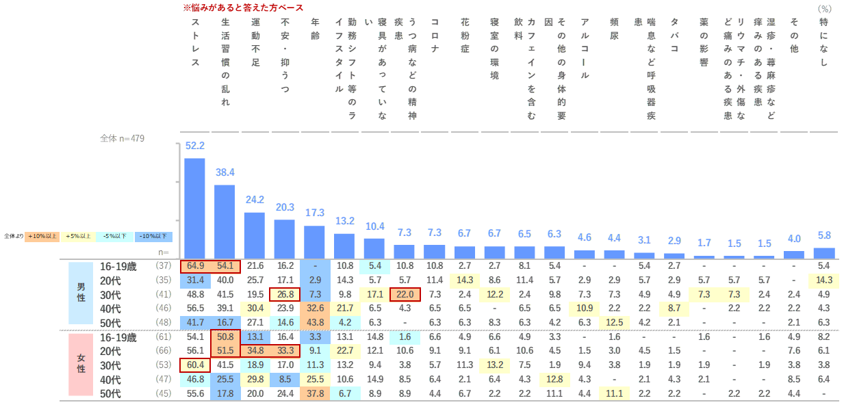 - 「ストレス」が52.2%と最も多く、「生活習慣の乱れ」38.4%、「運動不足」24.2%が上位に挙がる。「ストレス」は男性10代に多く、「生活習慣の乱れ」も男性10代、女性10・20代の若年層に多い。