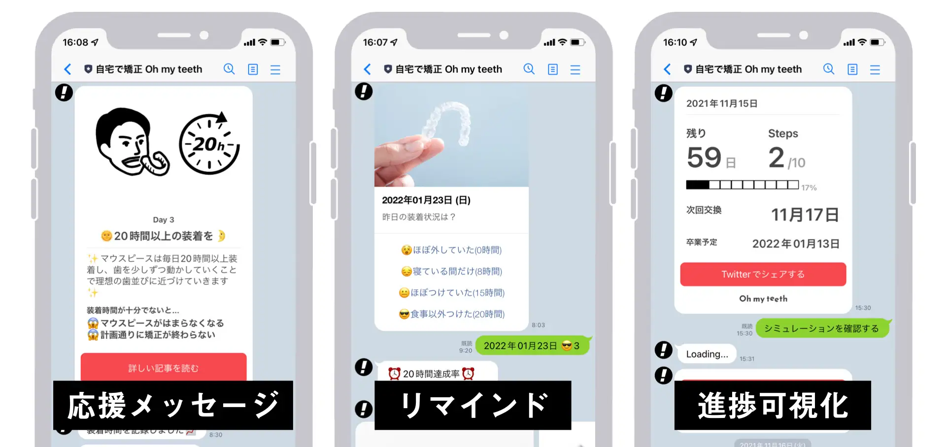 Oh my teethは次の3つの機能によってユーザーのモチベーションを維持し、矯正完走までサポートします。