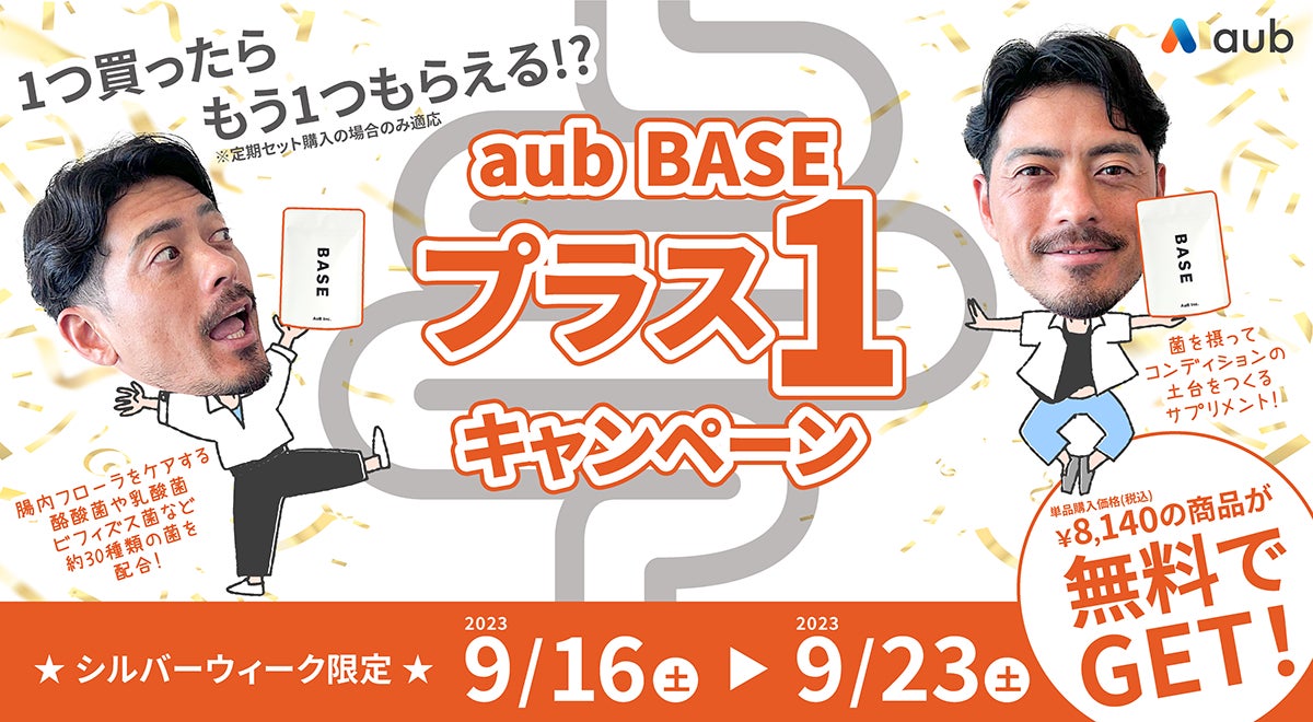これらの要因が重なることで、シルバーウィークの時期に体調を崩しやすくなる方も多いのではないでしょうか。したがって、シルバーウィーク後に心地よい秋を過ごすためにも、今から体調管理を始めることが大切だと考え、シルバーウィーク期間限定で、多様な菌を「摂って」自走する健康の土台をつくるサプリメント aub BASEを1つ買うともう1つ無料でついてくるお得な腸活キャンペーンを実施いたします。