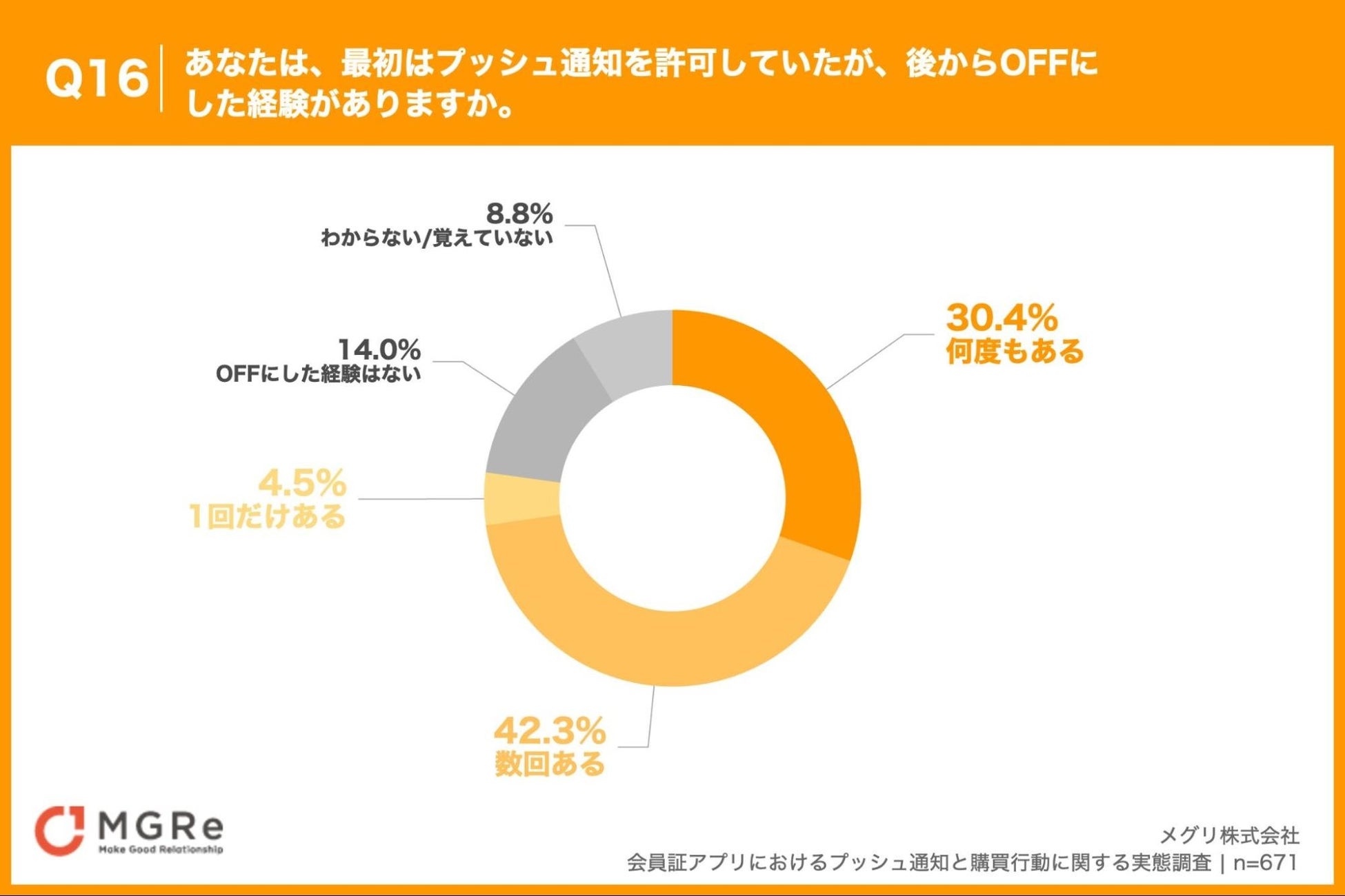 「Q16. あなたは、最初はプッシュ通知を許可していたが、後からOFFにした経験がありますか。」(n=671)と質問したところ、「数回ある」が42.3%、「何度もある」が30.4%という回答となりました。