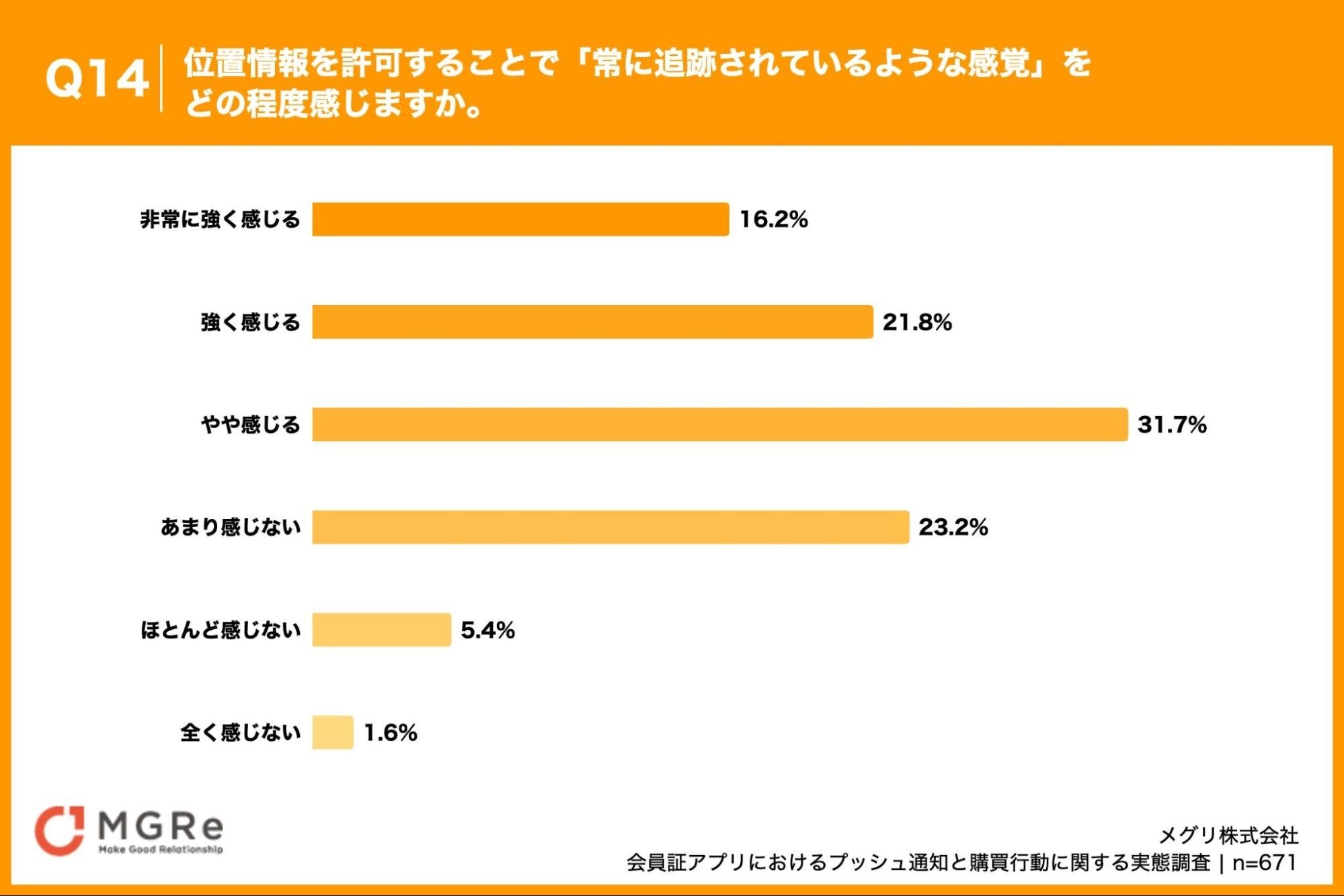 「Q14. 位置情報を許可することで「常に追跡されているような感覚」をどの程度感じますか。」(n=671)と質問したところ、「やや感じる」が31.7%、「あまり感じない」が23.2%という回答となりました。