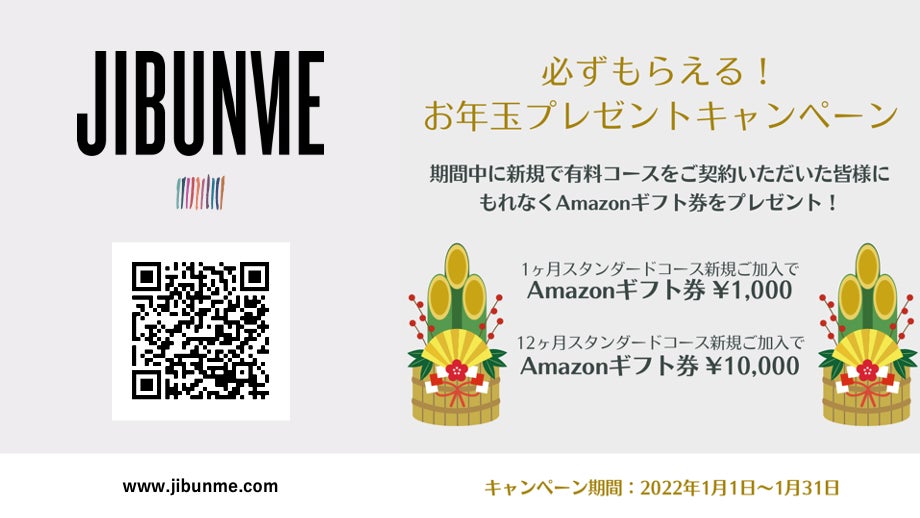 期間中にご契約いただいた方全員に、『JIBUNME』12ヶ月コースご契約で1万円分、1ヶ月コースご契約で1千円分のAmazonギフト券を24時間以内にメールでお送りします。