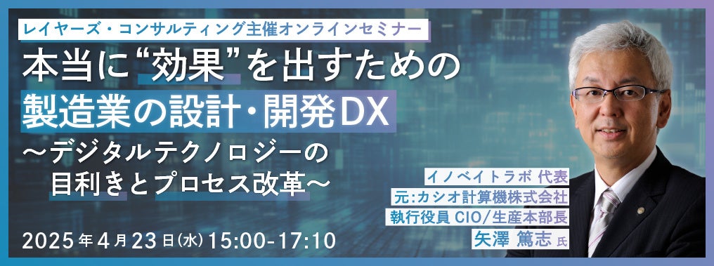 株式会社レイヤーズ・コンサルティング(東京都品川区、代表取締役CEO:杉野 尚志、以下:レイヤーズ)は、オンラインセミナー『本当に“効果”を出すための製造業の設計・開発DX ~デジタルテクノロジーの目利きとプロセス改革~』を2025年4月23日(水)に開催することを発表いたします。