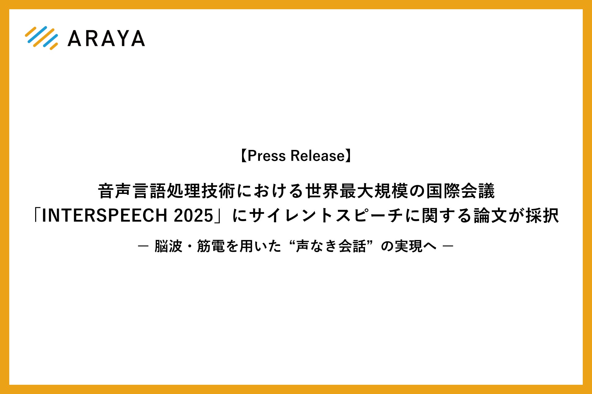 人工知能(AI)・脳神経科学の研究・研究開発支援を行う株式会社アラヤ(東京都千代田区 代表取締役社長:金井 良太、以下 アラヤ)は同社X-communicationチームが取り組むSilent Speech(無声発話)解読技術に関する論文(筆頭著者:井上昌和)が、音声言語処理技術における世界最大規模の国際会議「INTERSPEECH 2025」に採択されたことをお知らせいたします。本研究は、音声での発話が問題なく可能な方(以下:健常者)の脳波・筋電データによるAI訓練を通じて、発声が困難な患者の発話を高精度に解読可能とする、次世代のBrain-Machine Interface(BMI)技術の実現に向けた重要な一歩となる成果です。