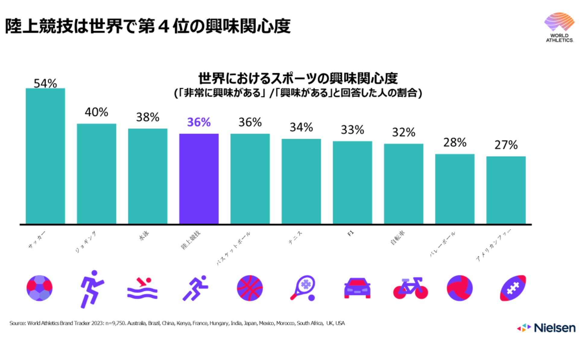 ニールセンの調査によると世界におけるスポーツの興味関心度で、陸上競技は、サッカー、ジョギング、水泳に次いで第4位。陸上競技は男女両方の種目に関心のあるスポーツとして第1位となっている。また、ブダペスト2023世界陸上競技選手権大会の観客の77%が、陸上競技にもっと頻繁に参加したいと回答、これは2022年オレゴン大会の調査41%から飛躍的に増加している。さらに、ブダペスト大会では、経済、メディア、社会、環境、観客動員の指標において総額4億800万USドル(約594億円)の経済効果をもたらした。