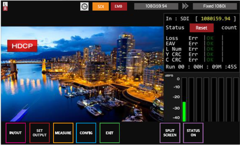 X_TS_V3へ入力されたSDI/HDMI信号情報を5型ワイド液晶へモニタリング表示します。入力信号のエラー情報や、HDMI信号のHDCP有無等の簡易的な信号情報の確認が行えます。