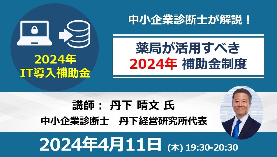 また、4/11(木) 19:30~「薬局が活用すべき2024年補助金制度」セミナーを開催し、中小企業診断士の丹下晴文氏より制度の内容や採択のポイントを解説いただきます。