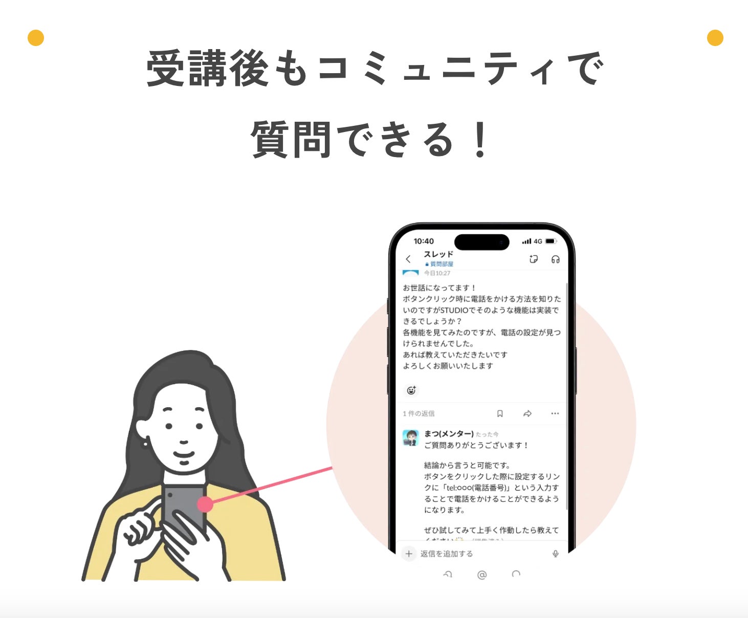 実際に「STUDIO」でのホームページ制作分野で活躍しているプロのクリエイターがメンターとして講義に参加。受講生のスキル習得を丁寧にサポートします。