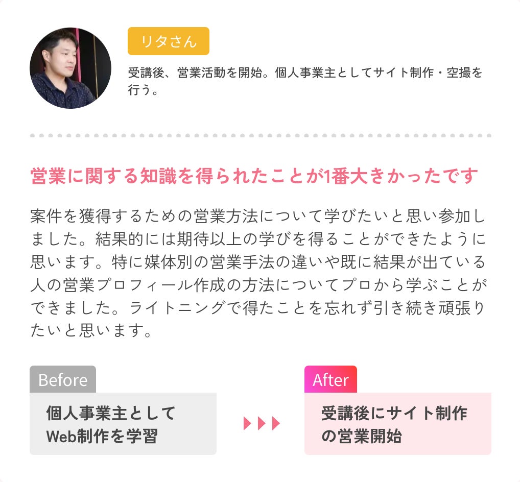 トライアルでの成果を踏まえ、さらに中身をバージョンアップさせた上で、この度、本格的なプランとしての提供開始を決定いたしました。「デイトラライトニング」では、ホームページ制作スキルのみならず、案件獲得のためのノウハウも一気に学べる構成なのが特長。そのため、現職が忙しい方でも土日に“タイパ”良く学習することができるのです。