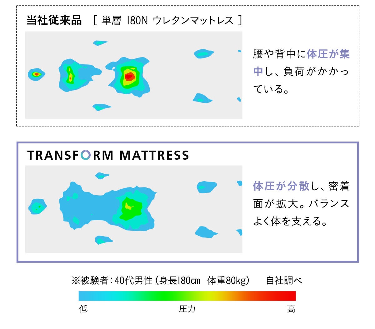 当社従来品の単層ウレタンマットレスに比べ、体圧分散に優れており、体全体をバランスよく支えます。