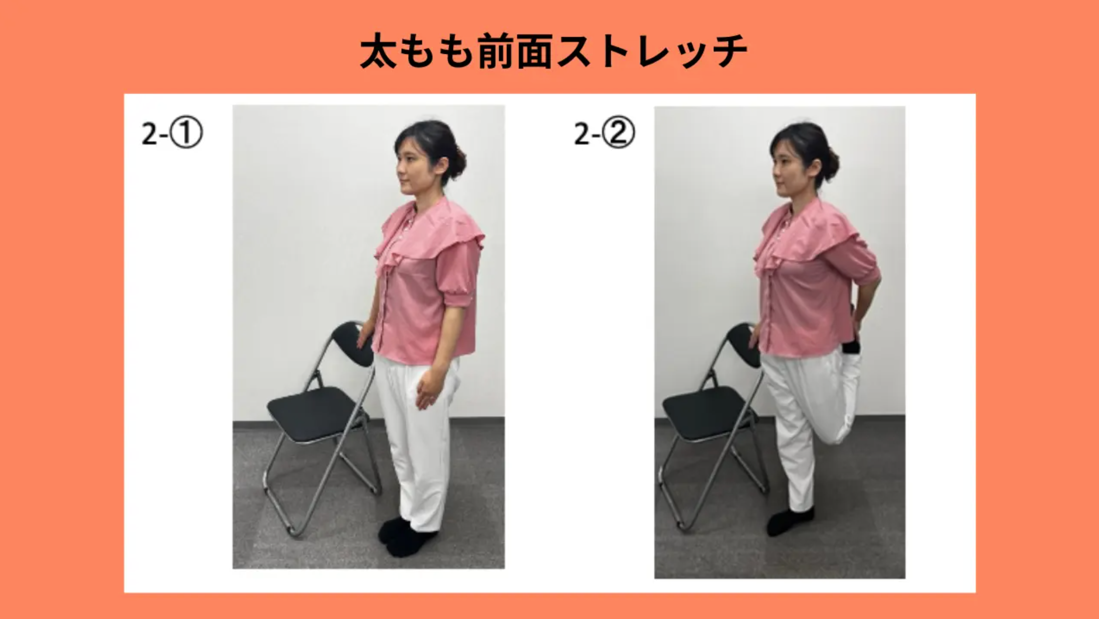 ② 片方のひざを曲げて足の甲を持ち、後ろに引き上げ10秒キープ。反対側も同様に行います