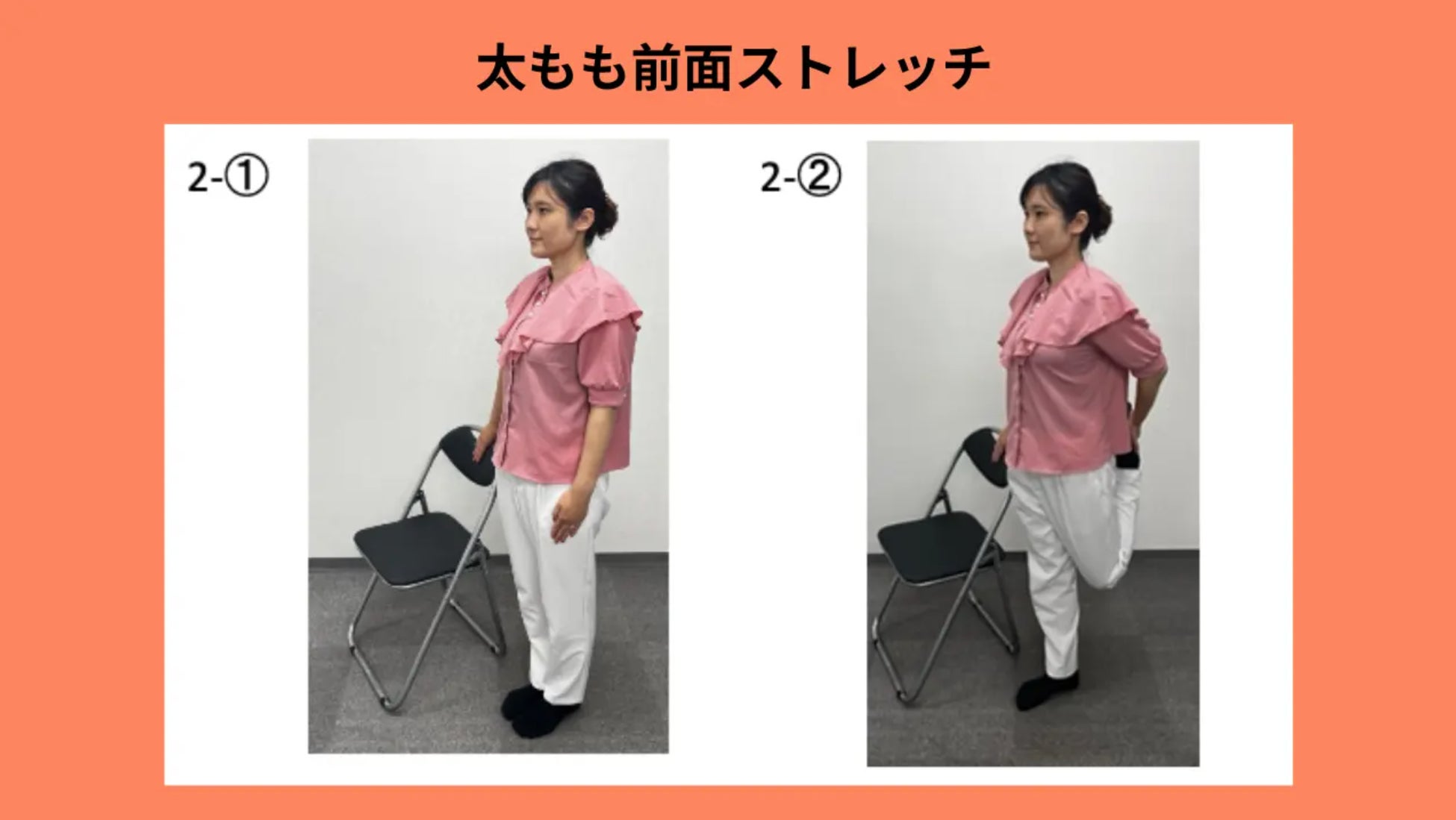 太もも前側の筋肉の柔軟性を高めるストレッチ。腰を反らさないよう注意しながらしっかり伸ばすのがポイント。