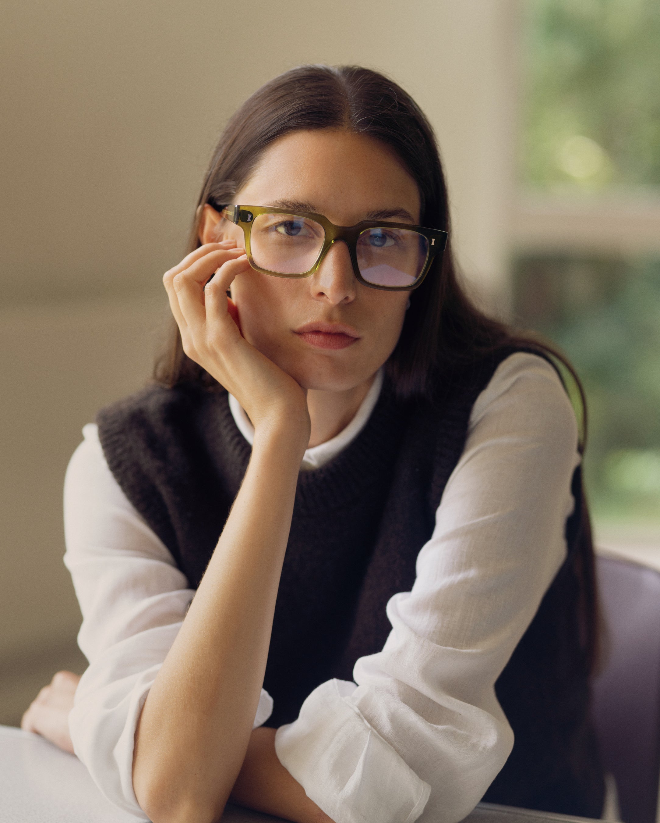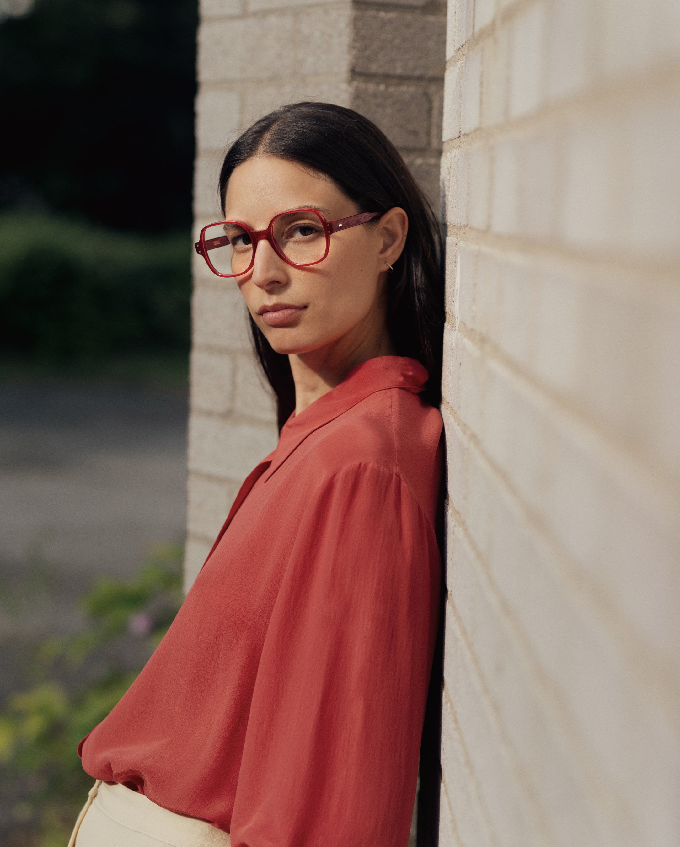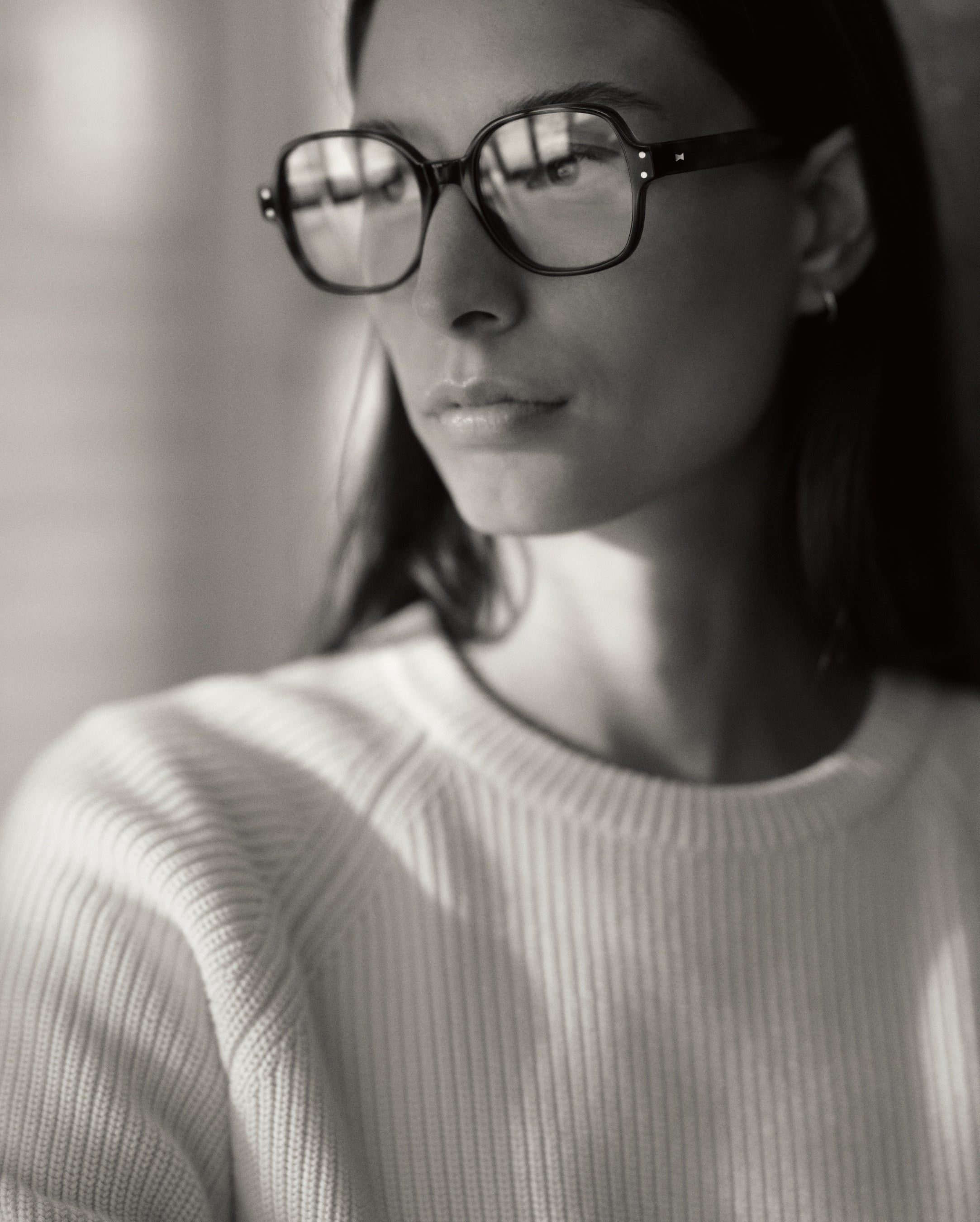 クラシックな“quadra(四角形)”シルエットを大胆に再構築したモデルで、太めのリム(縁)と左右対称に広がるテンプル(つる)が特徴。建築的で力強い印象を与えます。フレームの角はバレル技法(削り出し加工)によって鋭く仕上げられ、澄んだ彫刻のような美しさが際立ちます 。