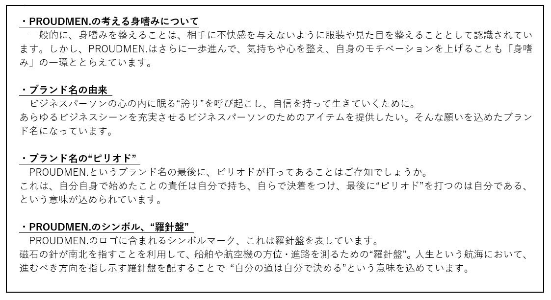 「華美に見せるのではなく、さりげなく上質にビジネスパーソンの身嗜みを整え、ビジネスシーンでの好印象、自信へつなげられる存在でありたい」というPROUDMEN.の想いと、櫻井貴史氏の活動や信頼感がマッチし、この度の起用にいたりました。