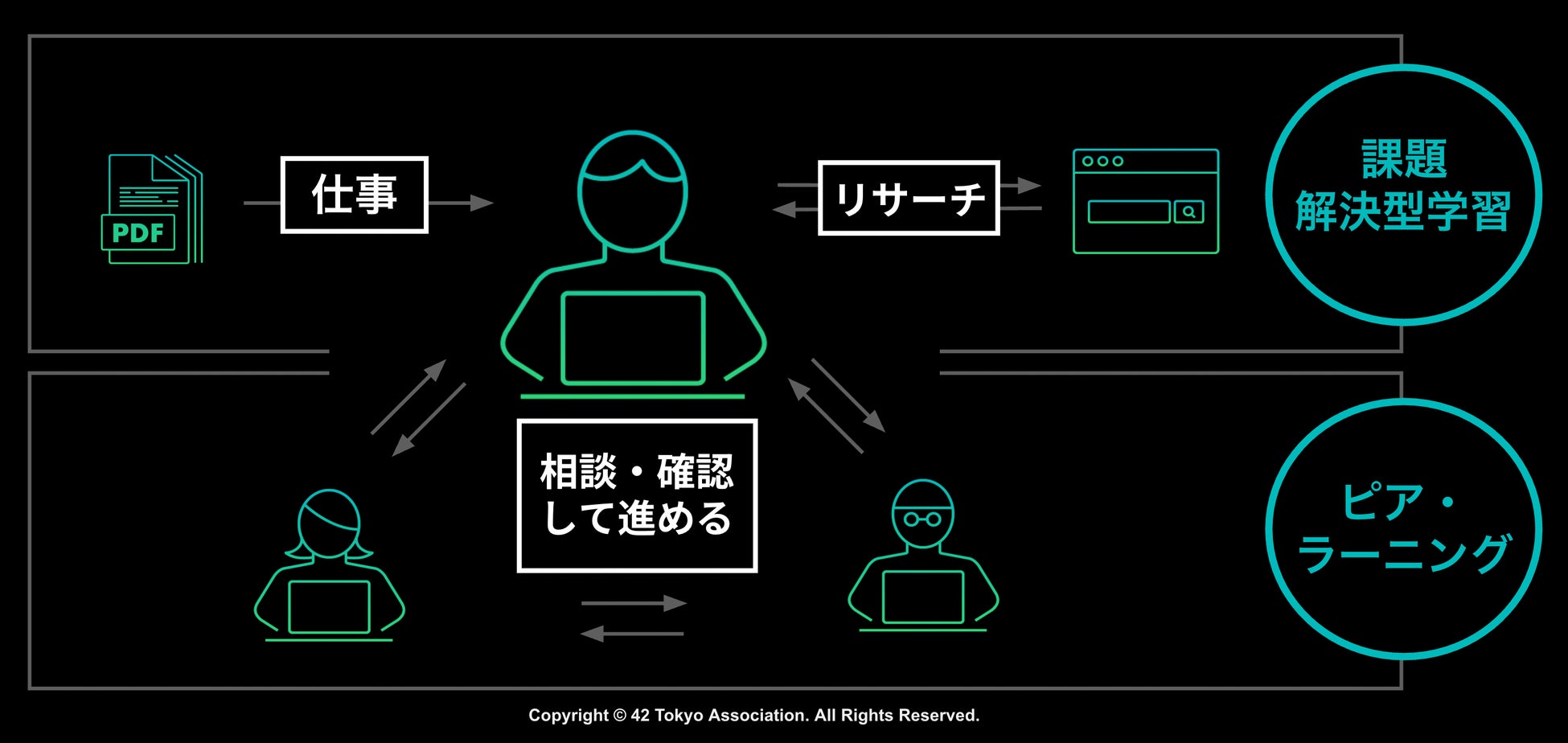 42 Tokyoでは「実際のエンジニアの仕事の進め方」に則った学習スタイルを採用しています。
