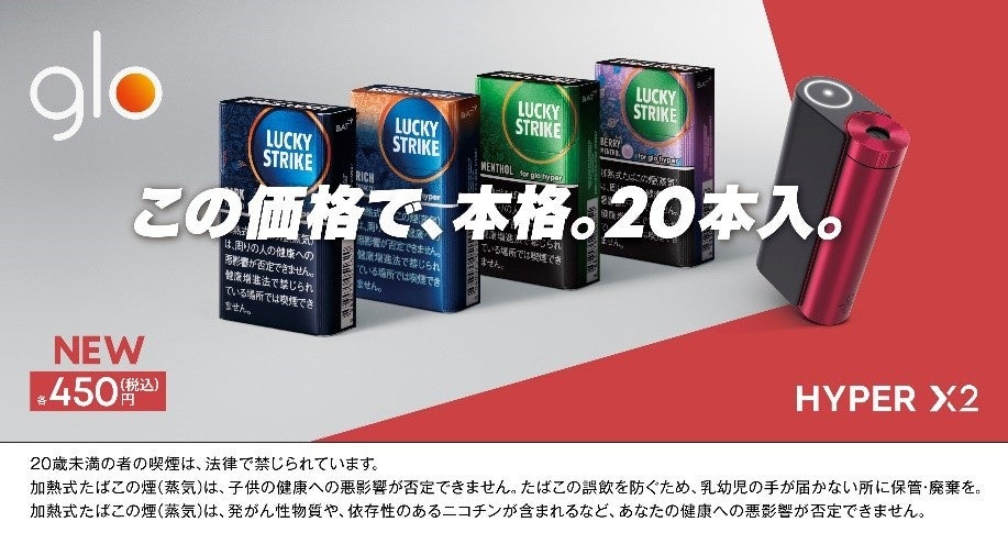 ブリティッシュ・アメリカン・タバコ・ジャパン(本社:東京都港区赤坂、社長:ジェームズ 山中)は、加熱式たばこ専用デバイス「glo(TM) hyper(グロー・ハイパー)」シリーズの専用たばこスティック「ラッキー・ストライク」から20本入りのラインナップ4銘柄を、本年11月28日(月)より順次、全国のコンビニエンスストアおよび全国のglo(TM)ストア、一般たばこ店(※1)、glo & VELOオフィシャルオンラインショップにて、450円(税込)で発売いたします。