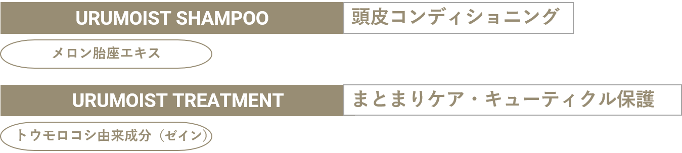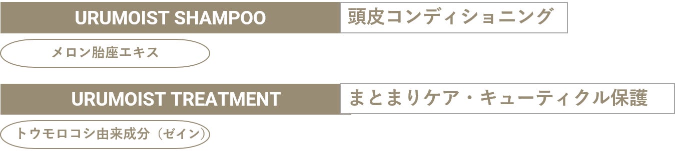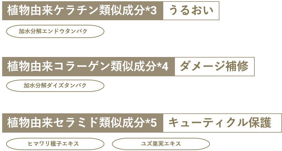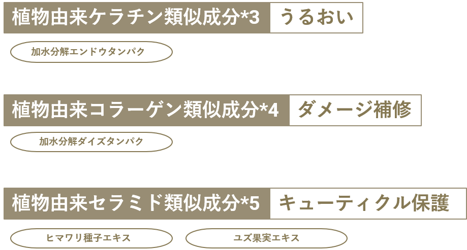 *うるおいを与え保つこと *1アルガニアスピノサ核油、オリーブ果実油、ホホバ種子油、シア脂、ワサビノキ種子油(すべて保湿成分) *2加水分解ダイズタンパク、加水分解エンドウタンパク、ジラウロイルグルタミン酸リシンNa、セラミドAP、セラミドNG、セラミドNP、セラミドEOP、ヒマワリ種子エキス、ユズ果実エキス(すべて補修成分) *3加水分解エンドウタンパク(補修成分) *4加水分解ダイズタンパク(補修成分) *5ヒマワリ種子エキス、ユズ果実エキス(すべて補修成分) *6シャンプー:1、*2、メロン胎座エキス、水添レシチン、フィトステロールズの複合成分、トリートメント:*1、*2、ゼイン、水添レシチン、フィトステロールズの複合成分 ※1シャンプーのみ ※2エタノール