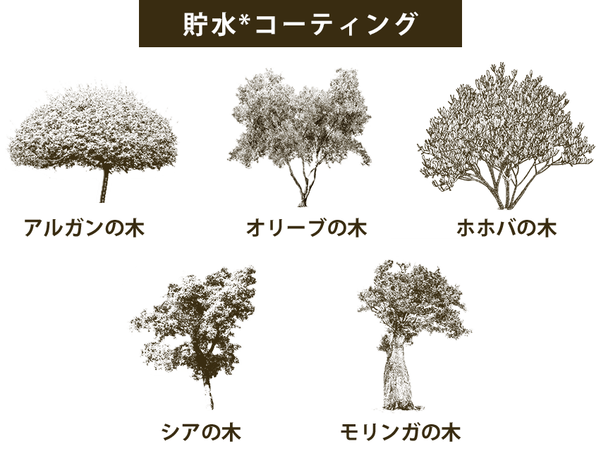 寒暖差、乾燥、湿気、紫外線など、厳しい環境のなか、樹木の生命力の源となるのが「貯水*力」と「補修力」です。byTREESには厳選された5つの樹木オイル*1がすべてのアイテムに共通配合。その5つの樹木オイル*1が髪を保水コートし保護することで、乾燥や摩擦など外的ダメージを防ぎます。