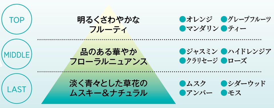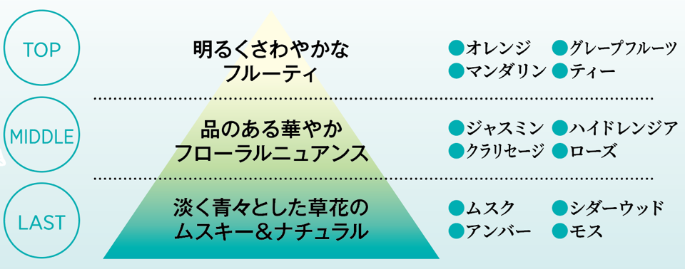 すっきりとしたグループフルーツやシトラスの軽やかな甘み、上品なティーの奥深い爽やかさをバランスよくブレンドして、淡く青々とした草花を思わせるハイドレンジア&ホワイトティーの香り。