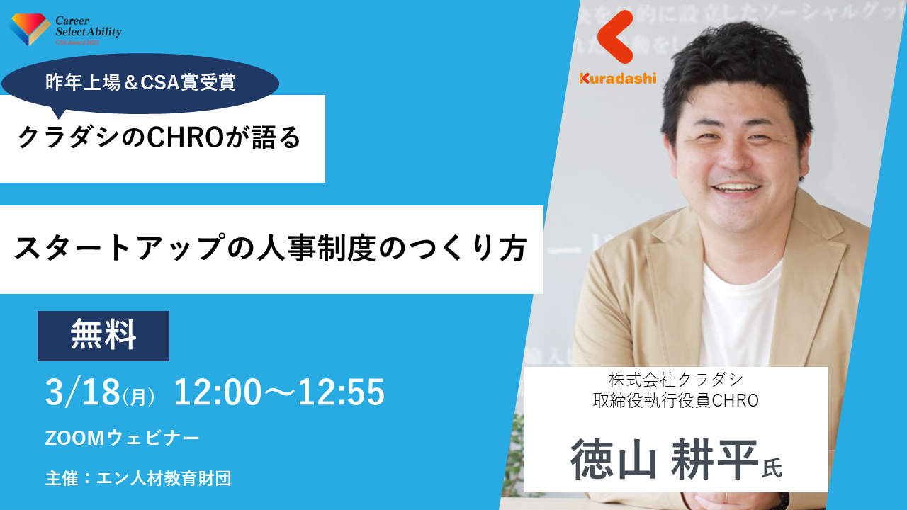 【3月18日開催 無料ウェビナー】人事必見!昨年上場&CSA賞受賞 株式会社クラダシのCHROが語るスタートアップの人事制度のつくり方