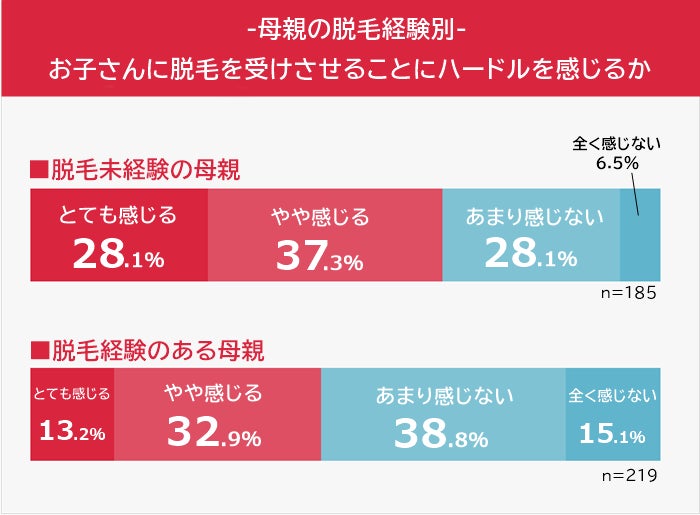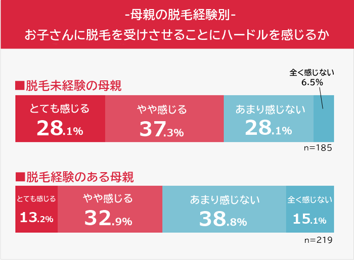 脱毛未経験の母親のほうが、子どもに脱毛を受けさせることに感じるハードルが20%ほど高くなっています。