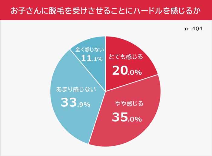 小学生~大学生の娘がいる母親404人に「お子さんに脱毛を受けさせることにハードルを感じるか」と聞いたところ、「とても感じる」「やや感じる」が合わせて55.0%という結果に。