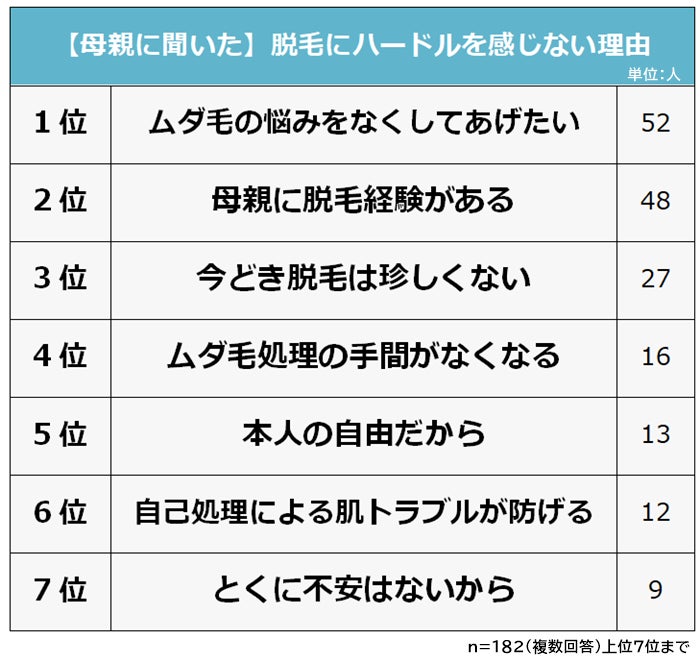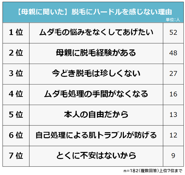 続いて、「お子さんに脱毛を受けさせることにハードルを感じない」と回答した母親182人に理由を聞いたところ、1位は「ムダ毛の悩みをなくしてあげたいから(52人)」でした。