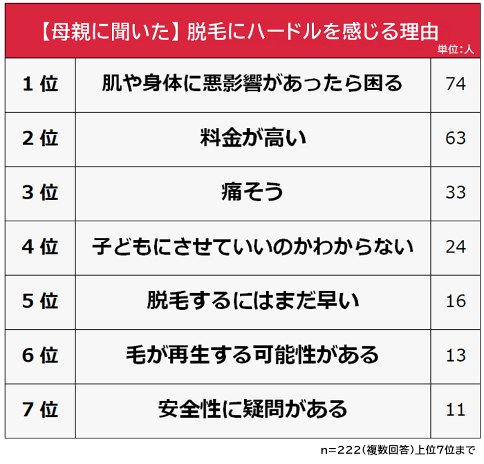 「お子さんに脱毛を受けさせることにハードルを感じる」と回答した母親222人に、ハードルを感じる理由を聞きました。その結果、最も多かった回答は「肌や身体に悪影響があったら困る(74人)」でした。