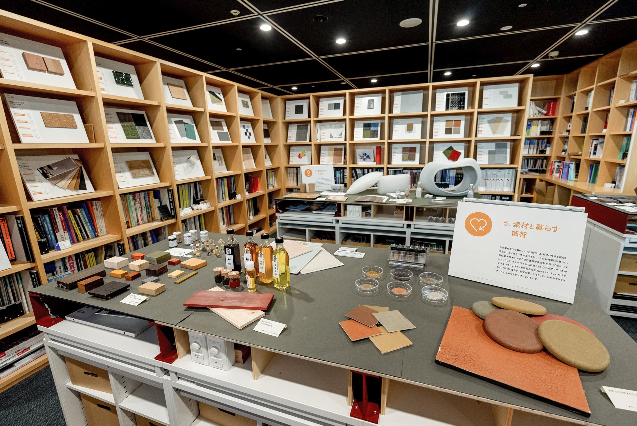 約100社の建材・原材料メーカーから情報を収集し、使い終わった後のリサイクル方法や、再生資源の活用方法を研究する活動を行っています。マテリアルを「地球環境」「資源循環」「人・社会」「意匠・経済」の4つの視点で研究し、当社オフィスでを常設展示しています。