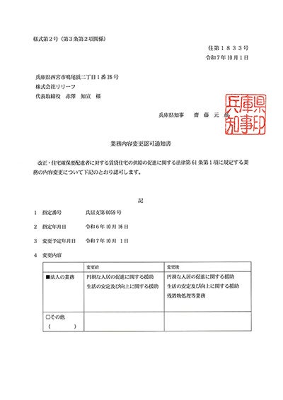 遺品整理・生前整理サービスを提供する株式会社リリーフ(本社:兵庫県西宮市、代表取締役:赤澤知宣)は、2025年10月1日に施行される改正住宅セーフティネット法に基づき、居住支援法人の新たな業務として追加される「残置物処理等業務」について、兵庫県の認可を取得したことをお知らせいたします。 これにより、単身高齢者などが抱える住まいの問題解決に加え、社会問題となっている空き家の発生予防にも貢献する新たな支援体制を構築します。当社が長年培ってきた専門知識を活かし、賃貸人・賃借人双方の不安を解消することで、誰もが安心して住まいを確保できる社会の実現を目指してまいります。