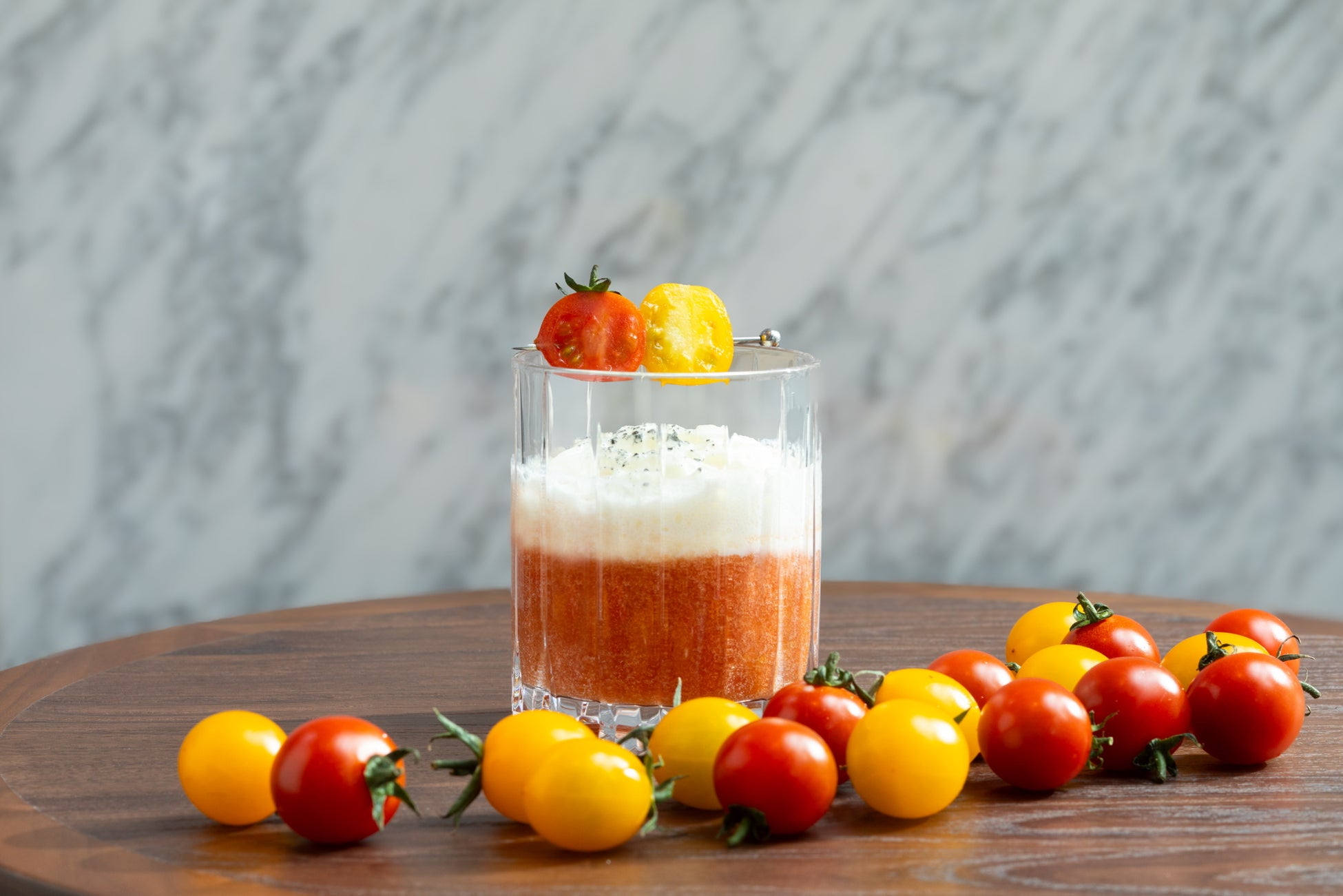 湘南産の完熟トマトのみを使用した果汁100%のトマトジュースにウォッカを合わせ、甘く豊かな酸味を持つチェリートマトとクランベリージュースでカクテルに深みを加えました。仕上げにオリーブオイルのミルクエスプーマを乗せることで、よりイタリアンの味わいに。ネーミング通り、デザート感覚でもお召し上がりいただけます。