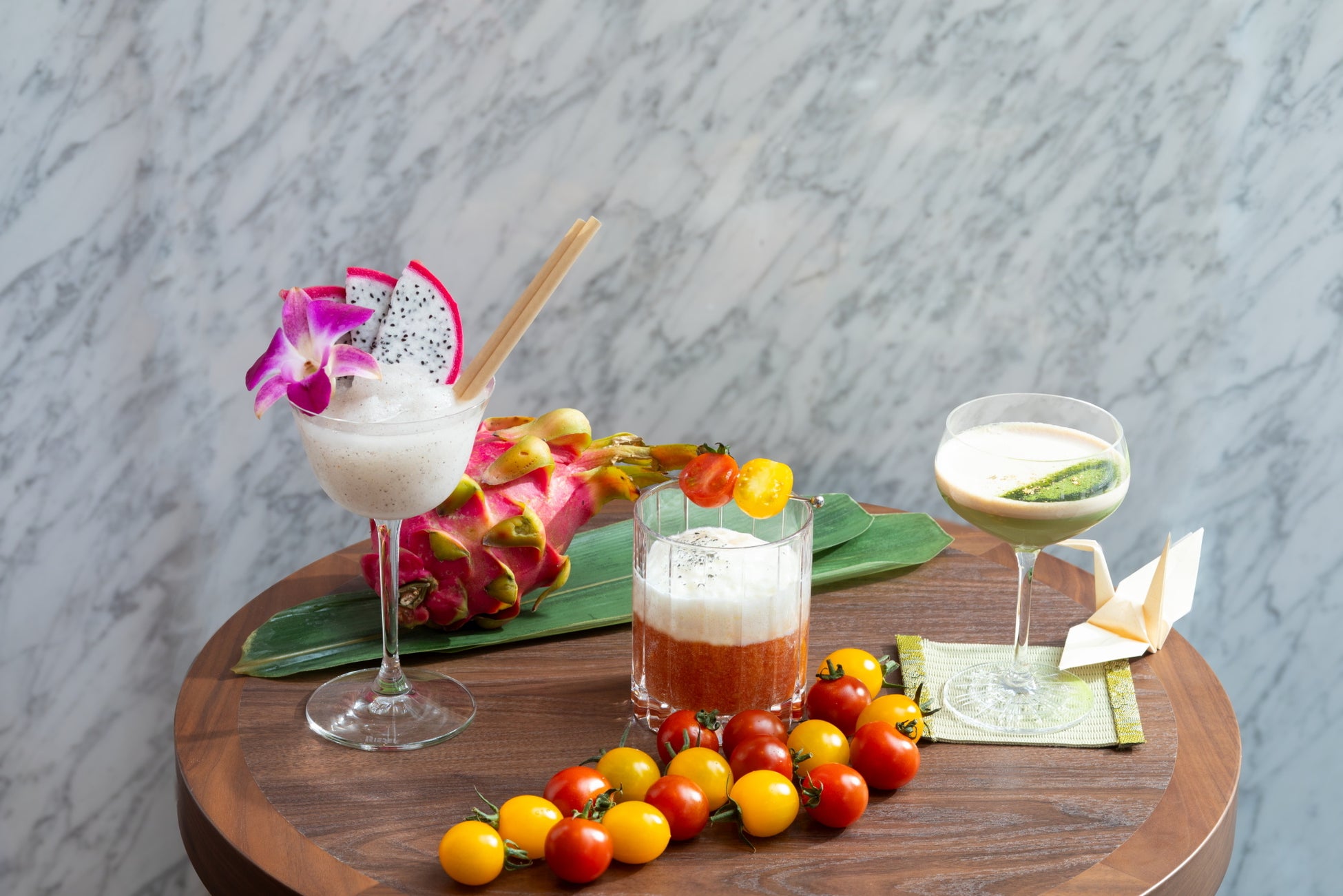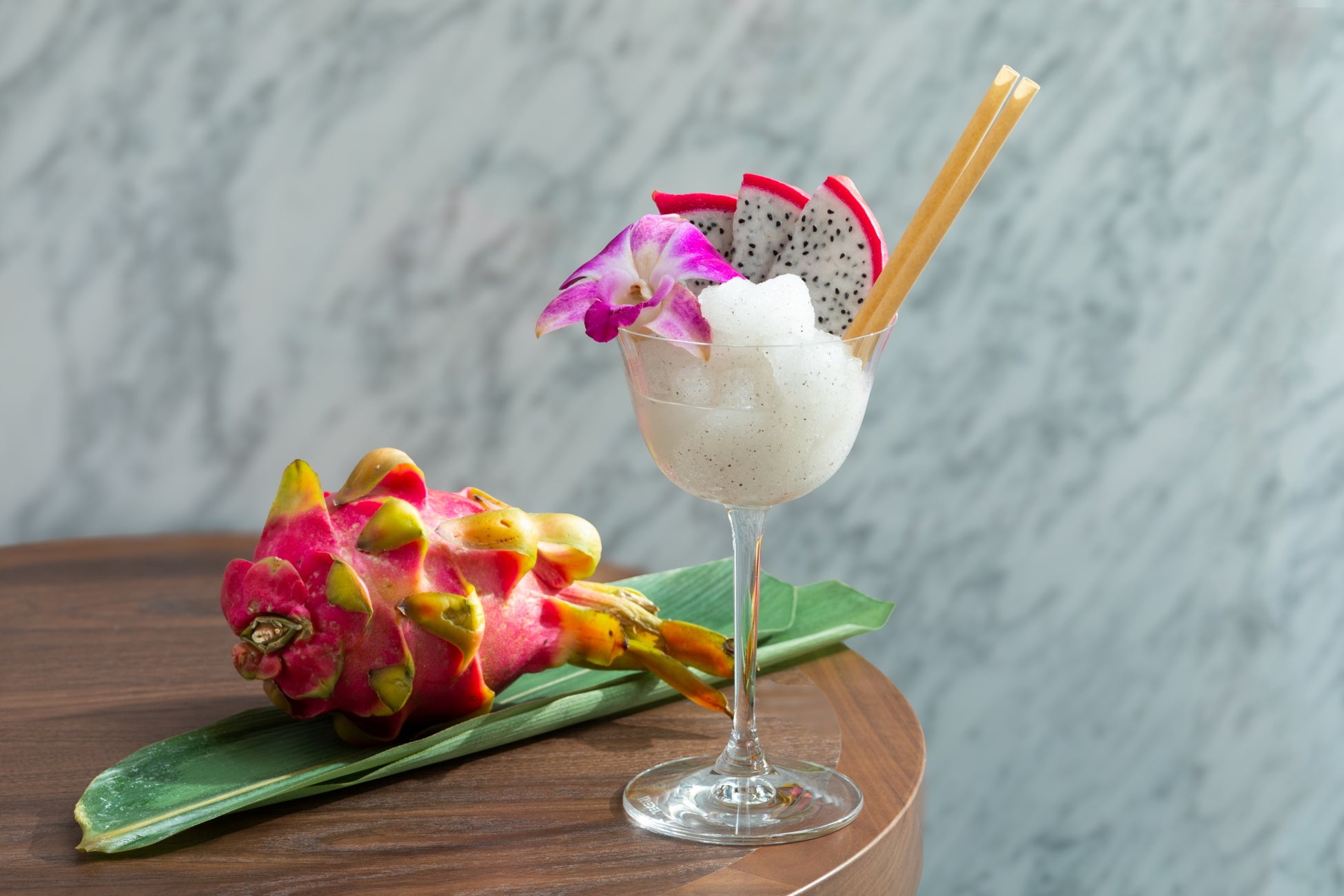 「St-Germain」を合わせ、香りづけにオーキッドシロップを数滴。ドラゴンフルーツのプチプチとした食感とお花の甘い香りが魅力的な一杯です。
