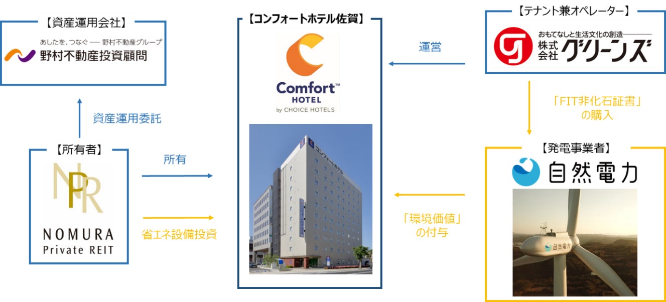 野村不動産投資顧問株式会社とグリーンズは、1年以上の期間をかけサステナビリティに関する取り組み方針やその具体的な在り方について協議を行っており、野村不動産プライベート投資法人とグリーンズにおいて、サステナビリティへの取り組みを協働して推進していくことについて合意しており、その一環として取り組むものです。同ホテルの具体的なサステナビリティに関する取り組みを検討するなか、自然電力株式会社が提供するトラッキング付FIT非化石証書に着目し、佐賀県内における「環境価値」の地産地消を目指し取り組むものです。