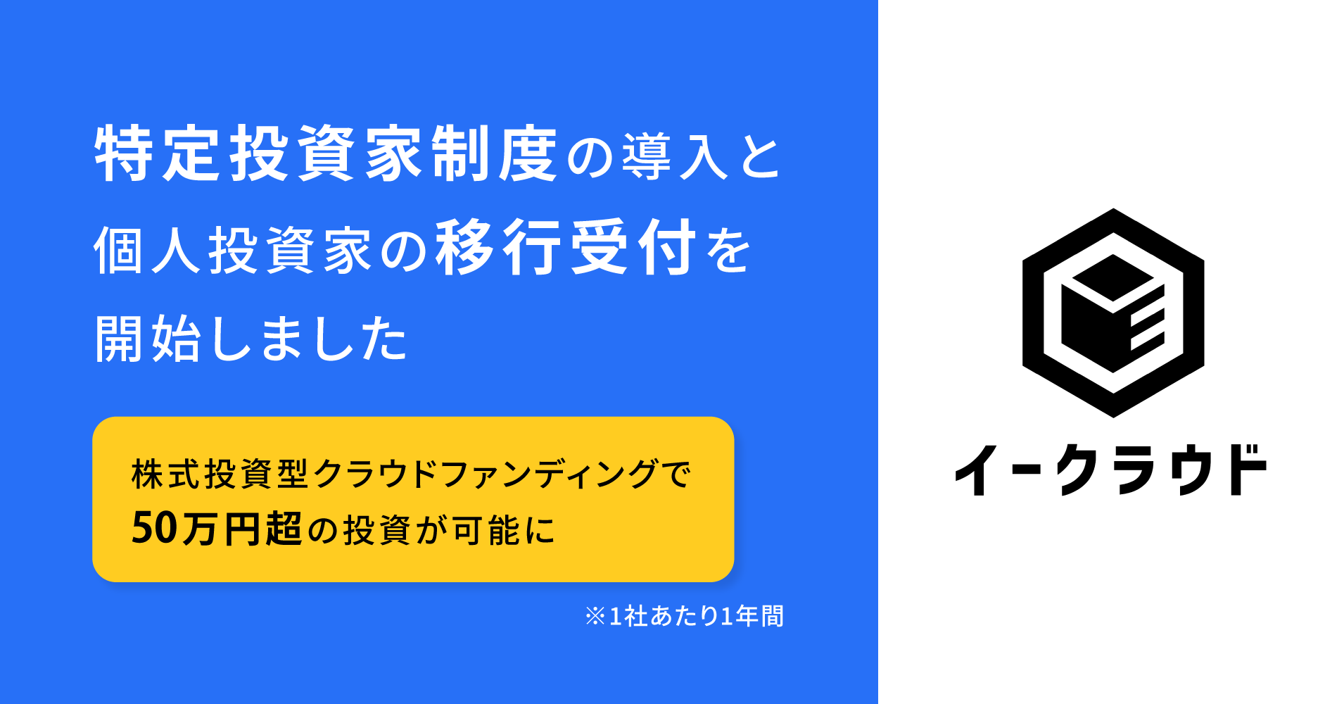 株式投資型クラウドファンディングを運営するイークラウド株式会社(東京都中央区、代表取締役:波多江直彦、以下「イークラウド」)」は、2023年3月8日より特定投資家制度を導入し、個人投資家を対象に「特定投資家」への移行受付を開始いたします。