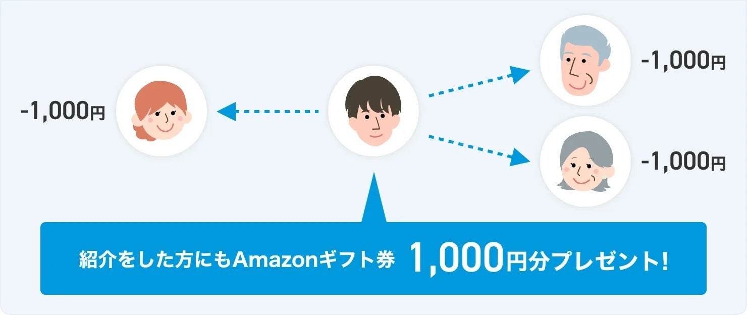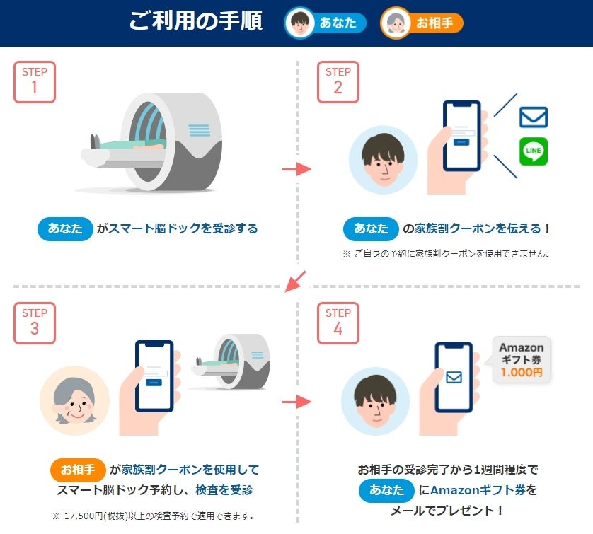 「スマート脳ドック」を受診された方の家族割クーポンを利用することで、ご家族やご友人の検査費用が1,000円割引になります。また、ご紹介いただいた方にも、1,000円分のAmazonギフト券をプレゼントします。