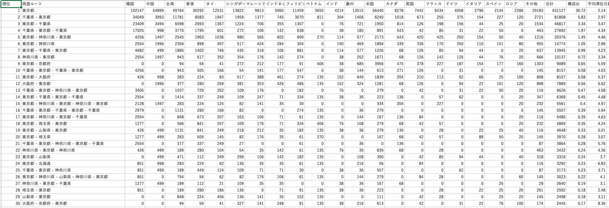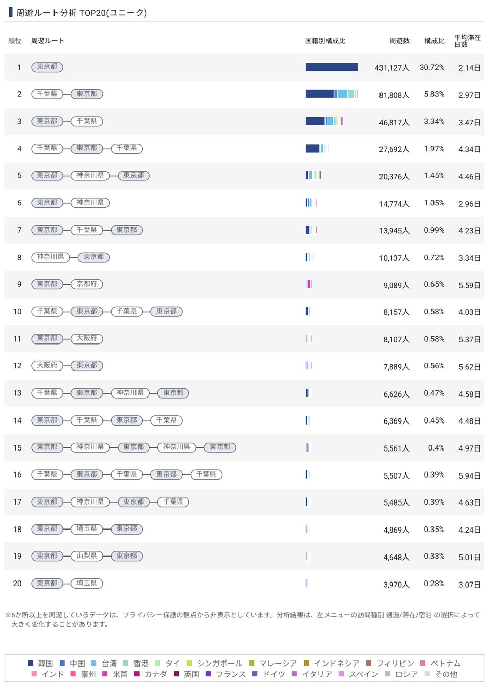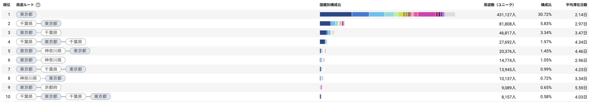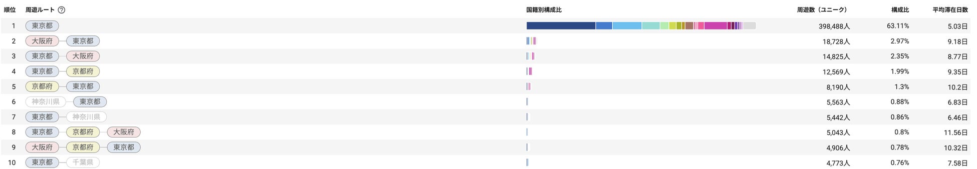 任意の期間に任意の都道府県/市区町村を訪れている訪日外国人が、訪日期間全体でどの都道府県/市区町村をどういう順番で周遊しているか、利用の多いルート順にランキング表示、その国籍別内訳を表示する機能です。例えば、2024年11月の東京都を選択した場合、以下のように、他にどの都道府県をどういう順番で周遊しているか、各ルートごとに利用の多い国籍は何かがわかります。