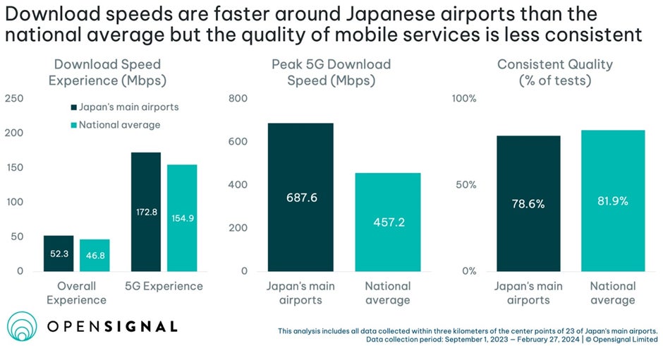 日本の空港では、旅客や空港職員向けのモバイル・サービスの質向上のため、5Gインフラへの投資が進められています。Opensignalの分析によると、日本の空港利用者は、全国平均よりも速いダウンロード・スピードと5G利用率を体感しています。