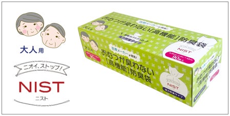 近年、高齢化社会に加えて新型コロナウイルス感染症の影響もあり、在宅介護を受ける高齢者が増加しています。在宅介護では、排泄物のにおいや体臭など、介護特有のニオイが大きな問題の一つです。特に排泄物は時間とともにニオイが強くなるため、介護される側と介護する側双方にとってストレスになりがちです。このたび新発売した『NIST(ニスト)おむつが臭わない[高機能]防臭袋 大人用』は、その課題に対応した、大人用おむつ向けの防臭袋です。時間の経過とともに強くなる排泄物のニオイも漏らすことなく長時間防臭。袋に入れて結んで捨てるだけで部屋やゴミ箱のニオイを軽減します。サイズの大きい大人用のおむつが入るよう、従来品にはなかったマチを追加。また、袋の横幅を1.5倍にサイズアップして新発売いたしました。ご家庭での使用に最適な大容量90枚入のBOXタイプです。