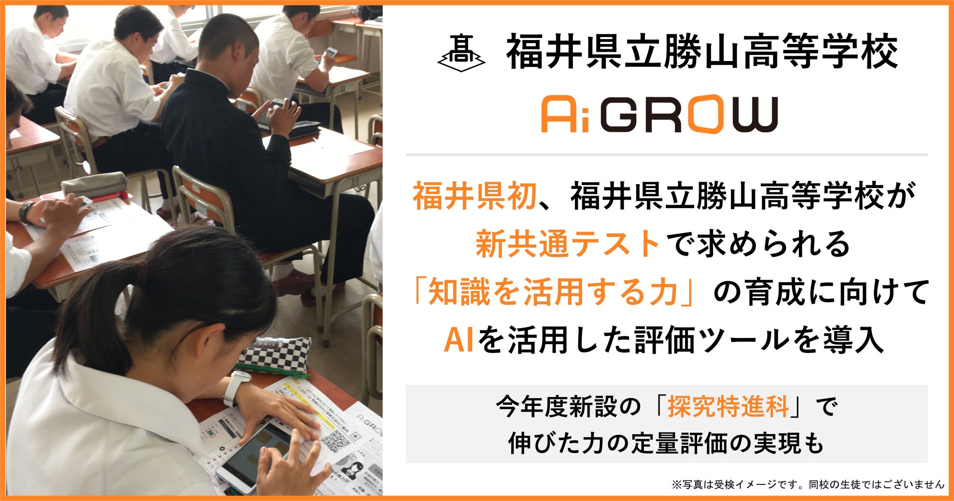 Institution for a Global Society 株式会社(本社 東京都渋谷区、代表取締役社長 福原 正大、以下 IGS)は福井県立勝山高等学校(以下、勝高)に、思考力・表現力・判断力などの「知識やスキルを活用する力」を、AIを活用して客観的に可視化する評価ツール「Ai GROW(アイ・グロー)」を、福井県初の事例として、有償導入いただいたことをお知らせします。12月20日(火)に、高校1年生 108名が「Ai GROW」を受検予定です。(取材可能)